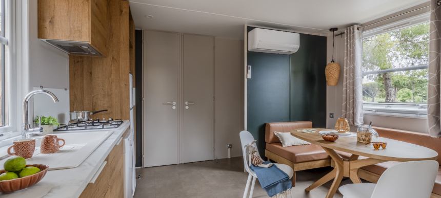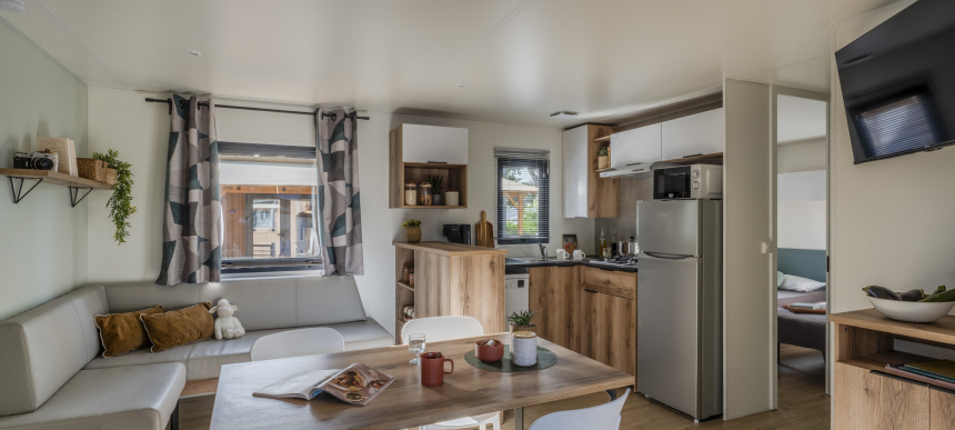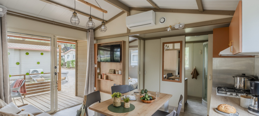 Ob Wohnmobilbesitzer oder Caravanliebhaber, Sie sind hier willkommen. Die Stellplätze, ausgestattet mit elektrischen Anschlüssen, sind einladend. Gerne können Sie Ihr Zelt auch auf einer Anhöhe im Schatten einer Eiche, Erdbeere oder Kiefer aufstellen: die Gegend ist fußläufig und die Ruhe bleibt erhalten. Sie haben einen eher mietähnlichen Geist? Sie haben die richtige Wahl getroffen, hierher zu kommen! Von der Cabane Toilée Famille von 17 m2 mit Terrasse (für 4 Personen) bis zum großen Chalet Pacific von 33 m2 mit 3 Schlafzimmern (für 6 Personen) bietet der Campingplatz eine breite Palette an Mietunterkünften. Unabhängig von der Zusammensetzung der Familie und Ihrem Budget finden Sie, was Sie suchen. Alle Mobilheime und Chalets sind mit Fernsehen ausgestattet und die komfortabelsten von ihnen haben eine Klimaanlage und eine Spülmaschine.