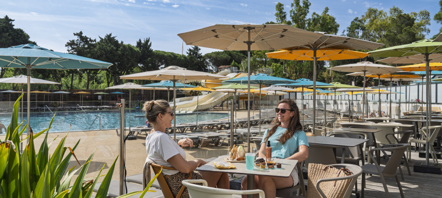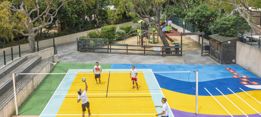 Tagsüber können Sie zu Fuß oder mit dem Shuttlebus (nur im Juli und August) die schönen Sandstrände erreichen: im Westen den großen Strand von Almanarre und im Osten den Strand von La Badine. Oder genießen Sie den brandneuen Wasserpark, der 2020 eingeweiht wird, mit seinen 780m² Pools und 2100m² Strand mit Liegestühlen und Sonnenschirmen. Der Wasserbereich, einzigartig auf der Halbinsel, verfügt über mehrere beheizte Becken von der Öffnung bis zur Schließung. Das Planschbecken und seine Wasserspiele sind ein Paradies für die Kleinen. Wenn Sie Spaß und Sensationen mögen, kommen Sie und probieren Sie die "Rafting"-Abfahrt oder die Aquatube aus und wenn Sie eher ein Entspannungsliebhaber sind, entspannen Sie auf den Sprudelbänken oder den Massagedüsen. Viel Spaß bei Wassergymnastik und Aquadance-Kursen.